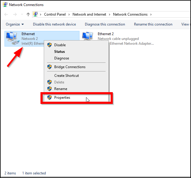 - Right-click the Ethernet network adapter and select Properties.