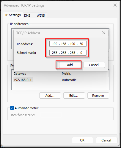 - Enter an IP address on the same subnet as the device’s default IP (e.g., 192.168.100.x, but not .1).