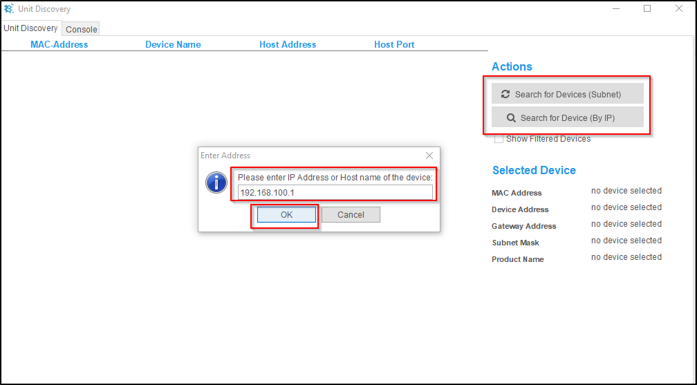 - Search for Device (By IP) — enter 192.168.100.1 (the default) and click OK.
