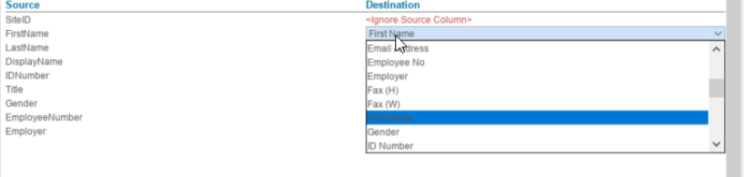 Map the source to destination by clicking on the red DESTINATION rows on the right, these are drop-downs that you can use to map your CSV source to the correct field in the database, save the profile by clicking the save button: